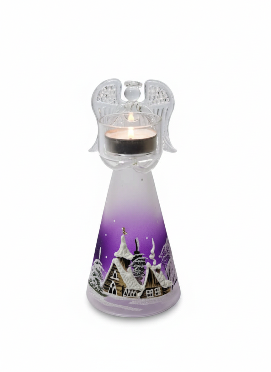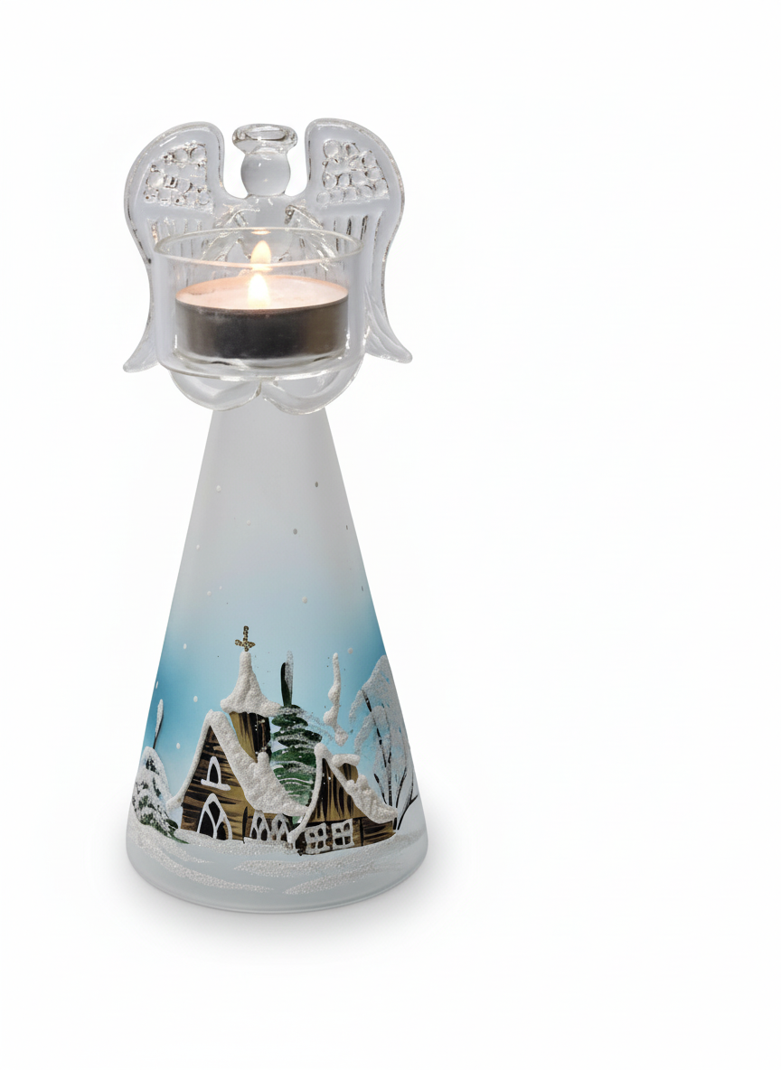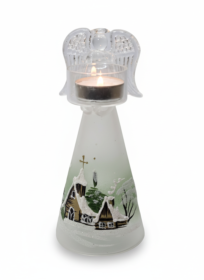 Elegantní svícen z kvalitního českého borosilikátového skla SIMAX s jemným motivem anděla. Ručně dekorovaný skleněný podstavec s malovanou zimní scenérií vytváří hřejivou atmosféru a je krásnou vánoční dekorací i dárkem. Vhodný pro čajovou svíčku.